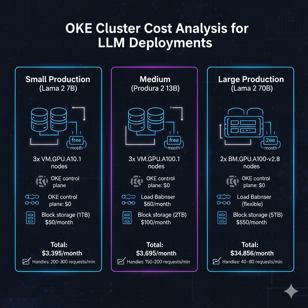 Small Production (Llama 2 7B): 3x VM.GPU.A10.1 = $3,285/month + $0 control plane + $60 load balancer + $50 block storage = $3,395/month, handling 200-300 requests/min.