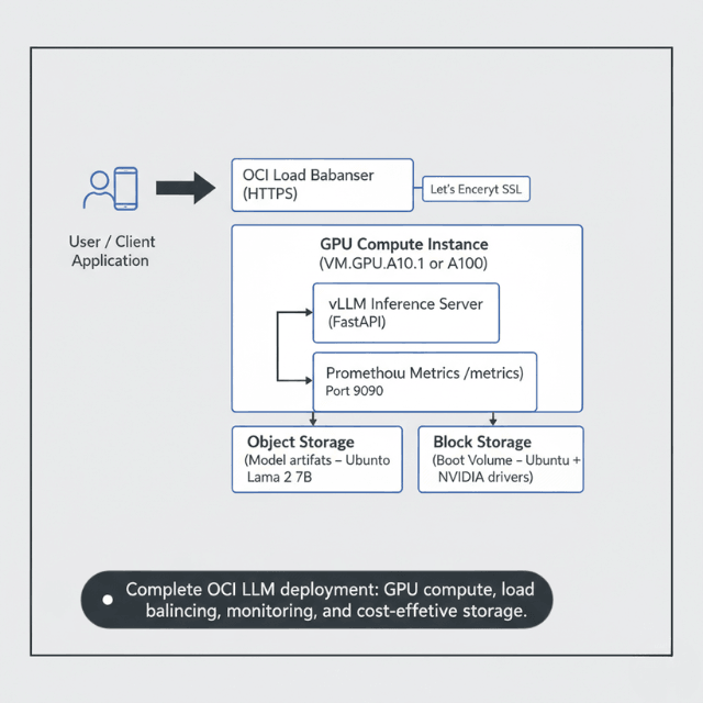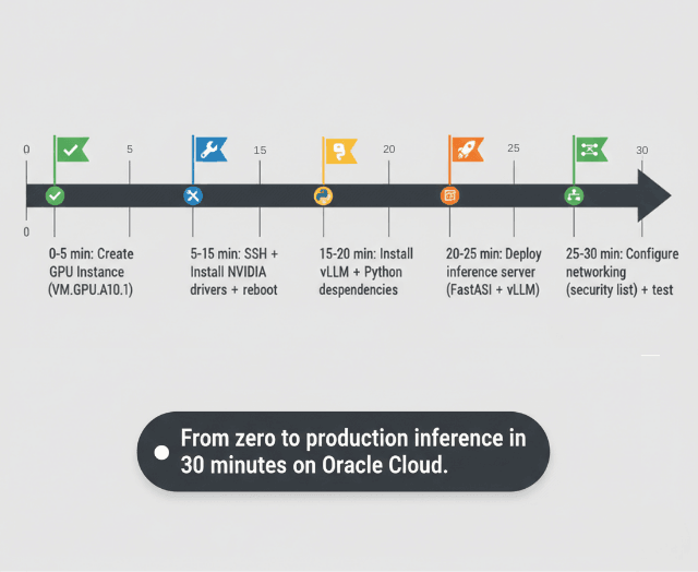 Oracle Cloud Infrastructure provides a fast, cost-effective path to production LLM deployment. Starting from zero, you can deploy Llama 2 7B on GPU instances within 30 minutes using vLLM for high-throughput inference.