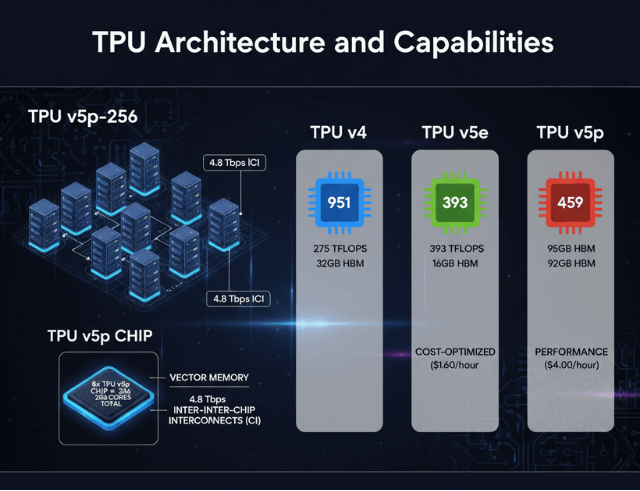 TPU v5p represents the latest generation, offering 459 TFLOPS of compute and 95GB high-bandwidth memory per chip.