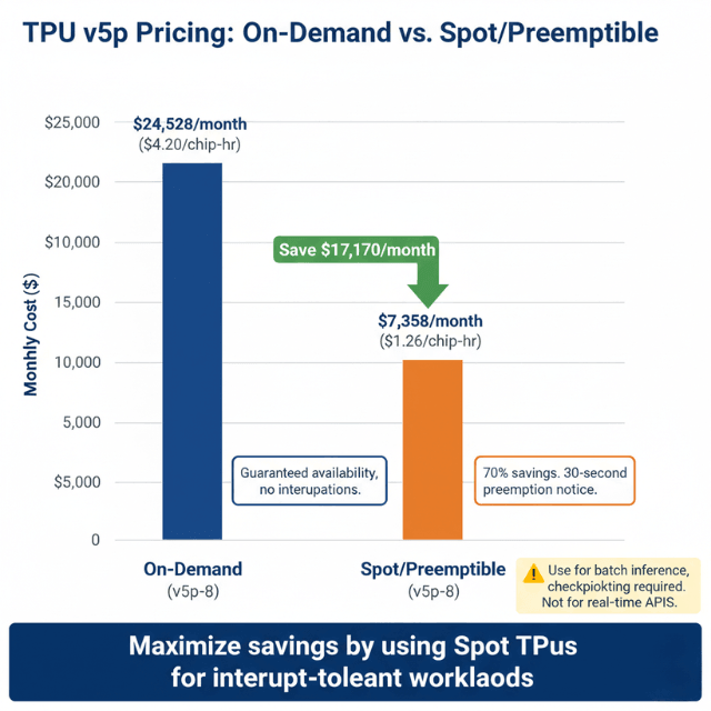 Spot/preemptible v5p costs $1.26/chip-hr — a 70% discount but instances can be preempted with minimal notice. For production inference, the 1-year CUD at $2.52/chip-hr is the most practical option.