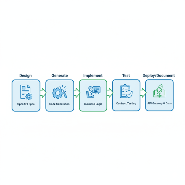 - API-first means contract first: Define your API using an OpenAPI specification before writing any implementation code. This spec becomes the single source of truth that drives development, documentation, and testing.
