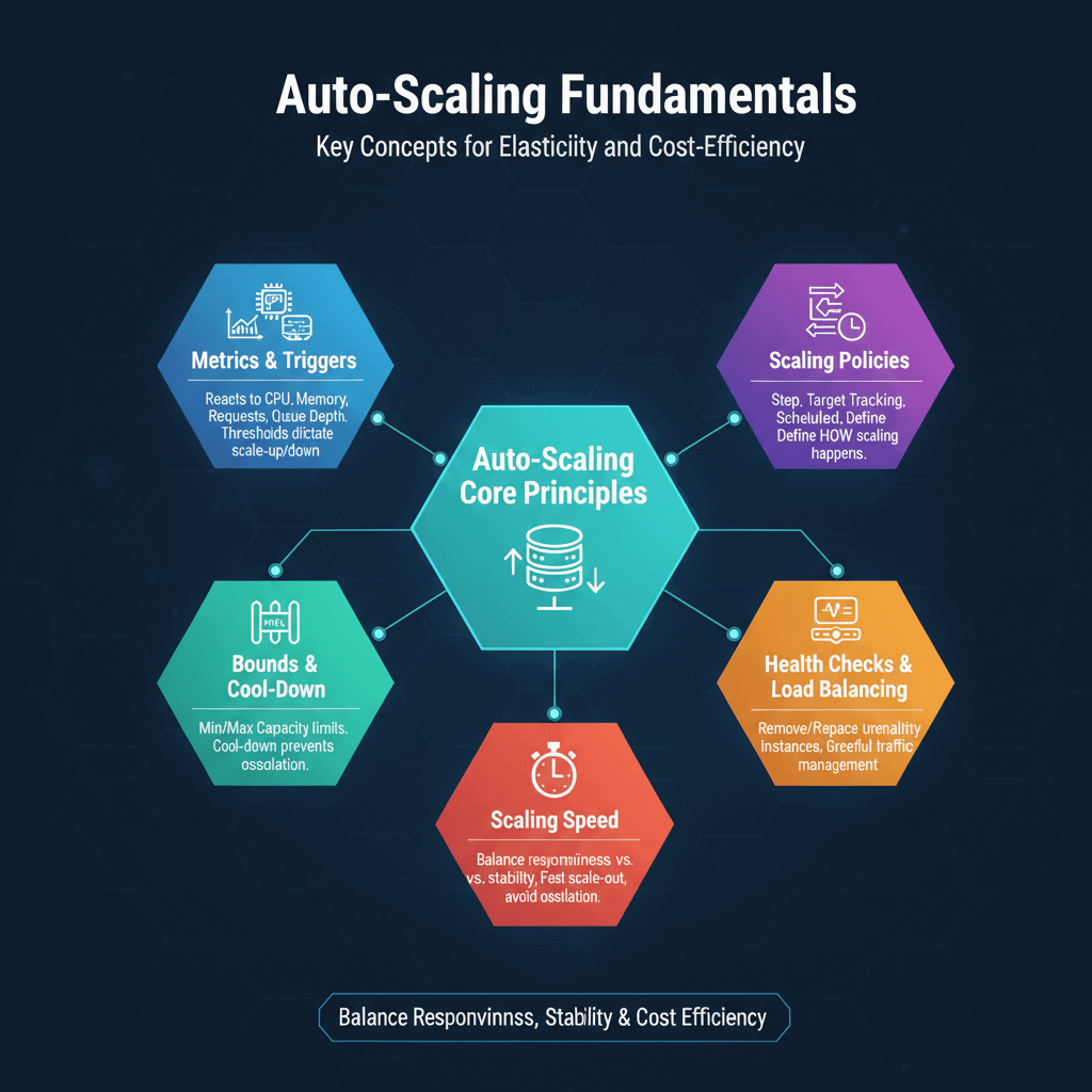 Auto-scaling automatically adjusts compute capacity based on demand. Traffic spikes trigger scale-out; quiet periods trigger scale-in. This elasticity optimizes both performance and costs. Each major cloud provider implements auto-scaling differently, with distinct features and configuration approaches.