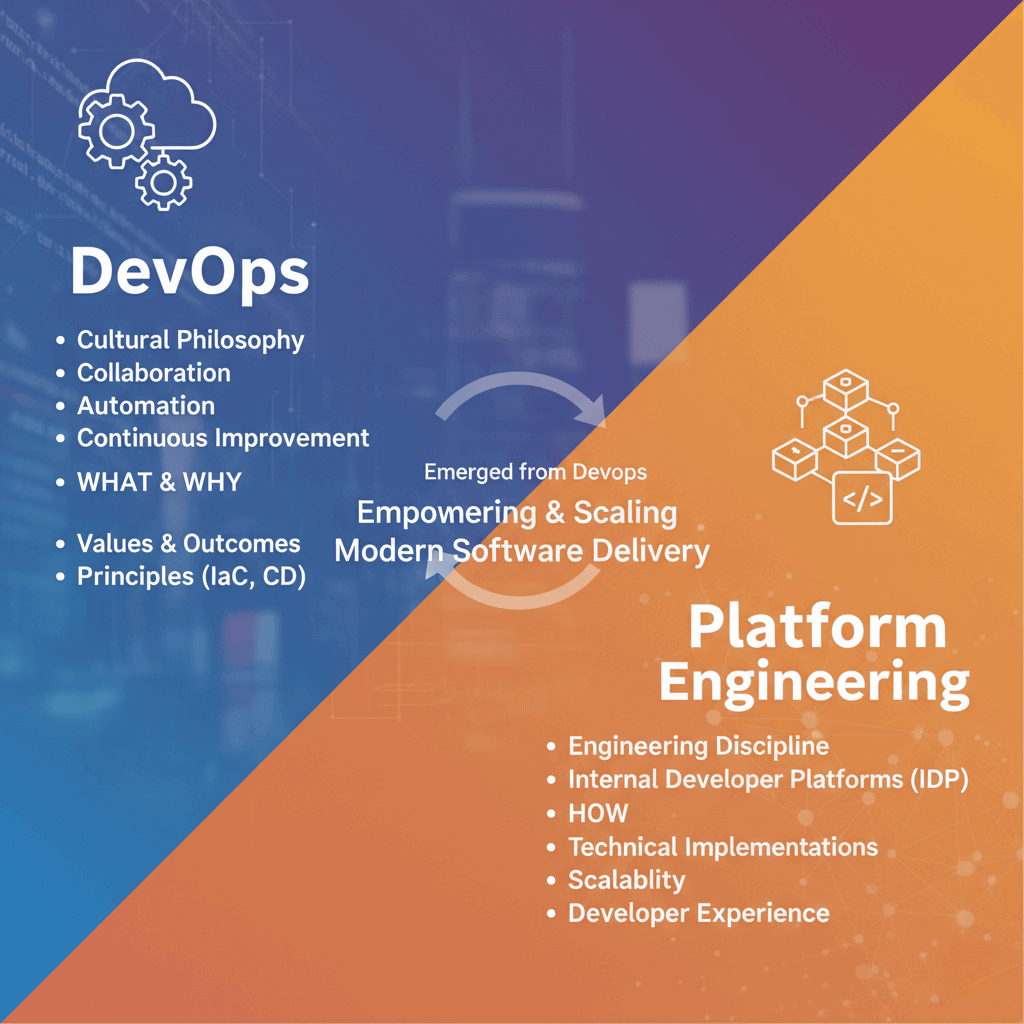DevOps defines "what" and "why," the cultural values and desired outcomes guiding software delivery. Platform engineering addresses "how," the concrete technical implementations making DevOps practices accessible and sustainable at scale. DevOps established principles like infrastructure as code and continuous delivery; platform engineering builds platforms making these principles practical for hundreds or thousands of developers.