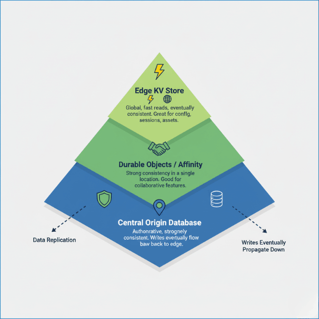 - Edge data is eventually consistent: Use edge KV stores for session data, config, and cached content—fast reads, but writes propagate with delay. For strong consistency, use Durable Objects or route to origin.