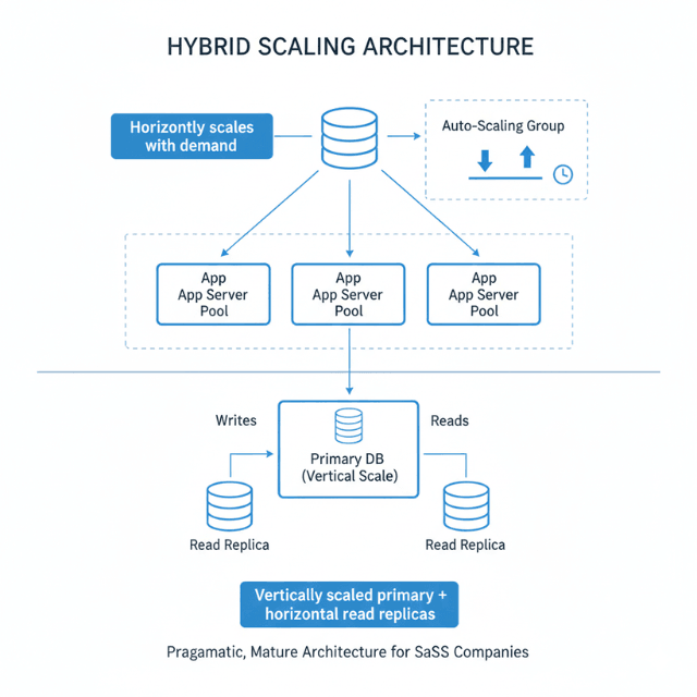 As you scale, the hybrid model becomes inevitable: stateless application tiers horizontally auto-scale to meet variable demand; databases vertically scale their primary instance while adding read replicas horizontally; caching layers cluster; and background workers scale independently.