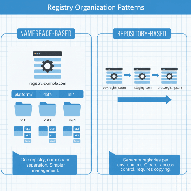 Registry structure determines access control, promotion workflows, and operational complexity. Two common patterns dominate: namespace-based and repository-based.