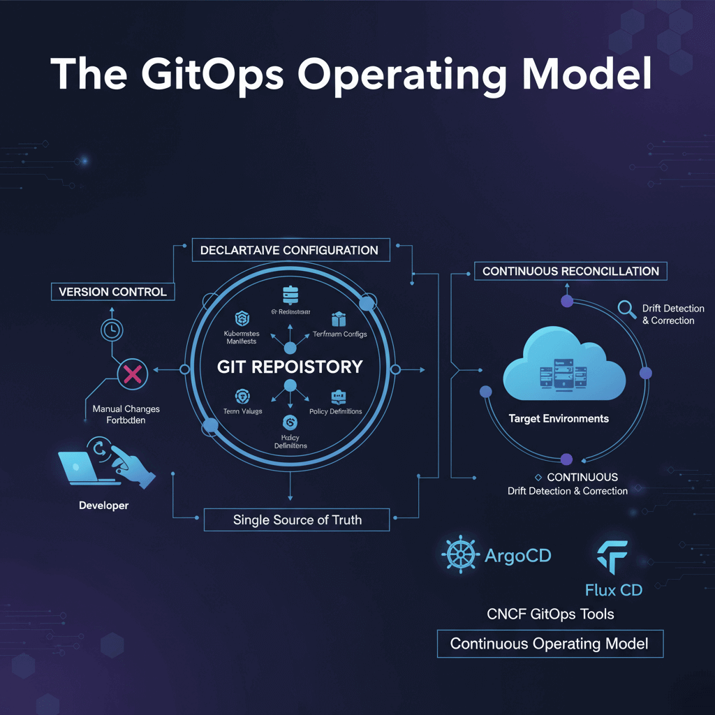 GitOps establishes Git as the single source of truth for infrastructure and applications. The methodology builds on declarative configuration, version control, automated synchronization, and continuous reconciliation.