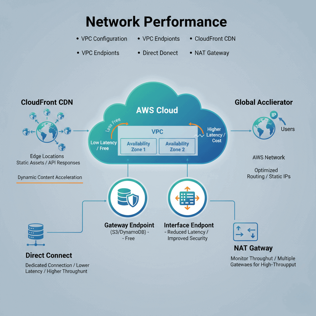 VPC configuration affects latency. Place resources in the same Availability Zone when possible to minimize cross-AZ latency. Cross-AZ traffic also incurs data transfer costs.