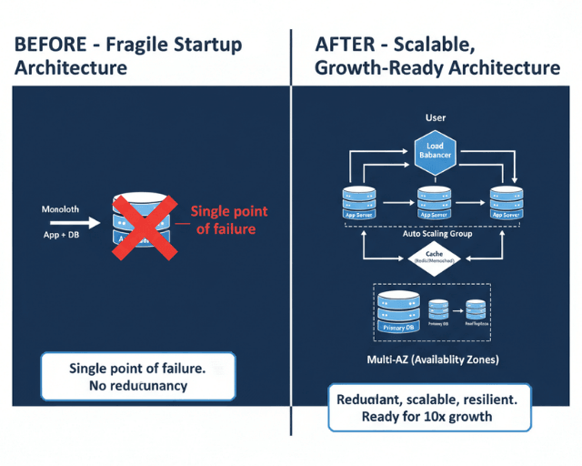 Early-stage architectures prioritize speed over scalability. Teams deploy monolithic applications on single instances, use basic database configurations, and skip redundancy to move fast. These decisions make sense at small scale but create brittleness.