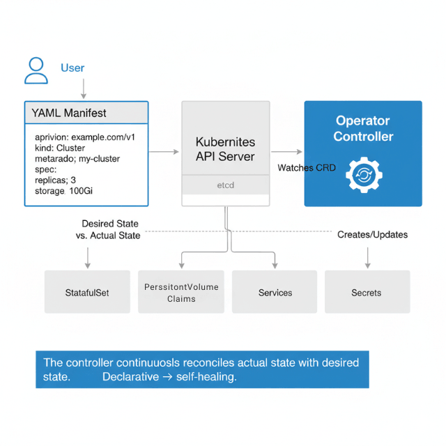 - Operators encode DBA expertise into software: They extend Kubernetes with custom resources (clusters, backups, users) and automatically handle provisioning, scaling, failover, and recovery—no manual scripts.