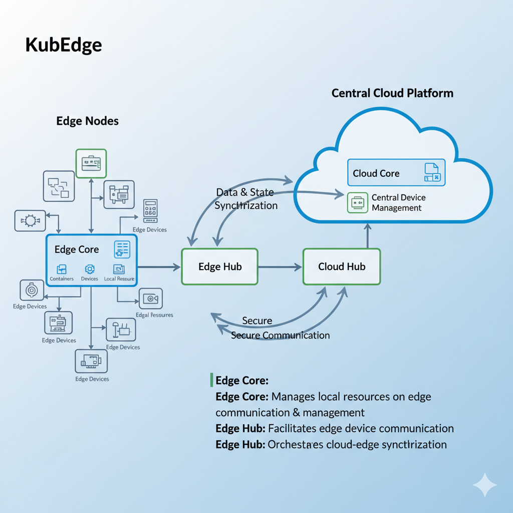 KubeEdge is an open-source extension of Kubernetes designed to bring native container orchestration and device management to edge environments. It enables real-time data processing, offline operation, and synchronization between edge nodes and the cloud, making it ideal for distributed use cases.
