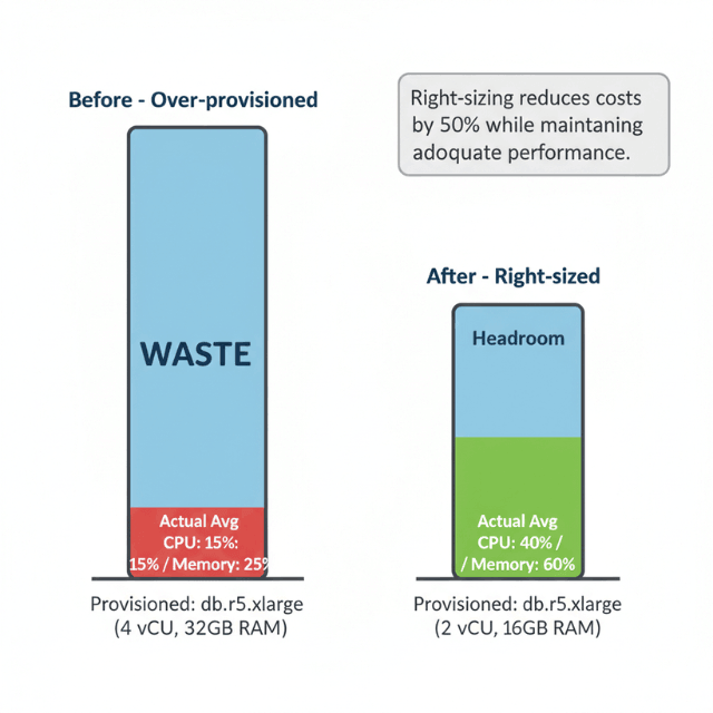 Amazon RDS cost optimization begins with instance rightsizing. Analyze CPU utilization, memory consumption, and IOPS patterns over representative periods identifying over-provisioned instances. Database instances consistently running below 40% CPU utilization represent downsizing opportunities where smaller instance types maintain adequate performance.