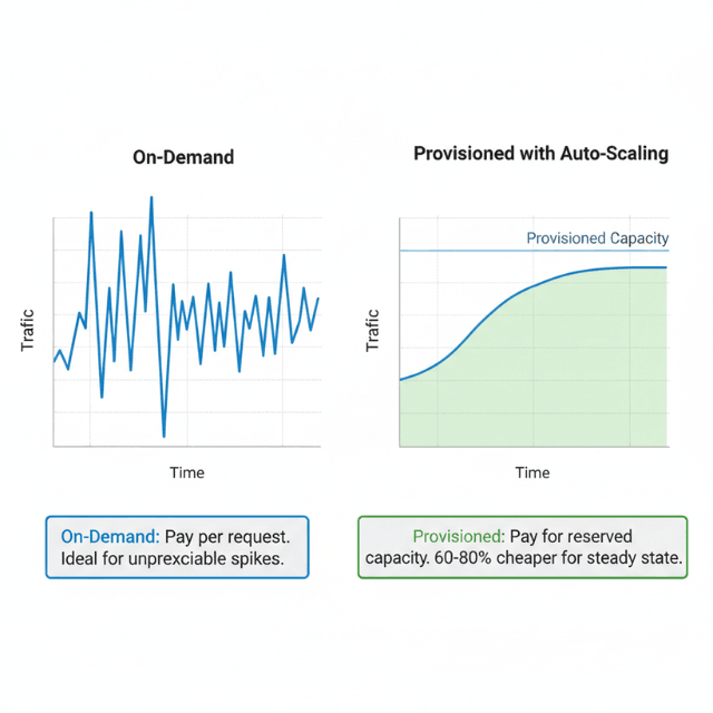 DynamoDB offers two capacity modes with different cost implications. On-demand capacity charges per request without capacity planning, ideal for unpredictable or sporadic traffic. Provisioned capacity requires forecasting but costs 60-80% less per request for consistent workloads exceeding baseline thresholds.