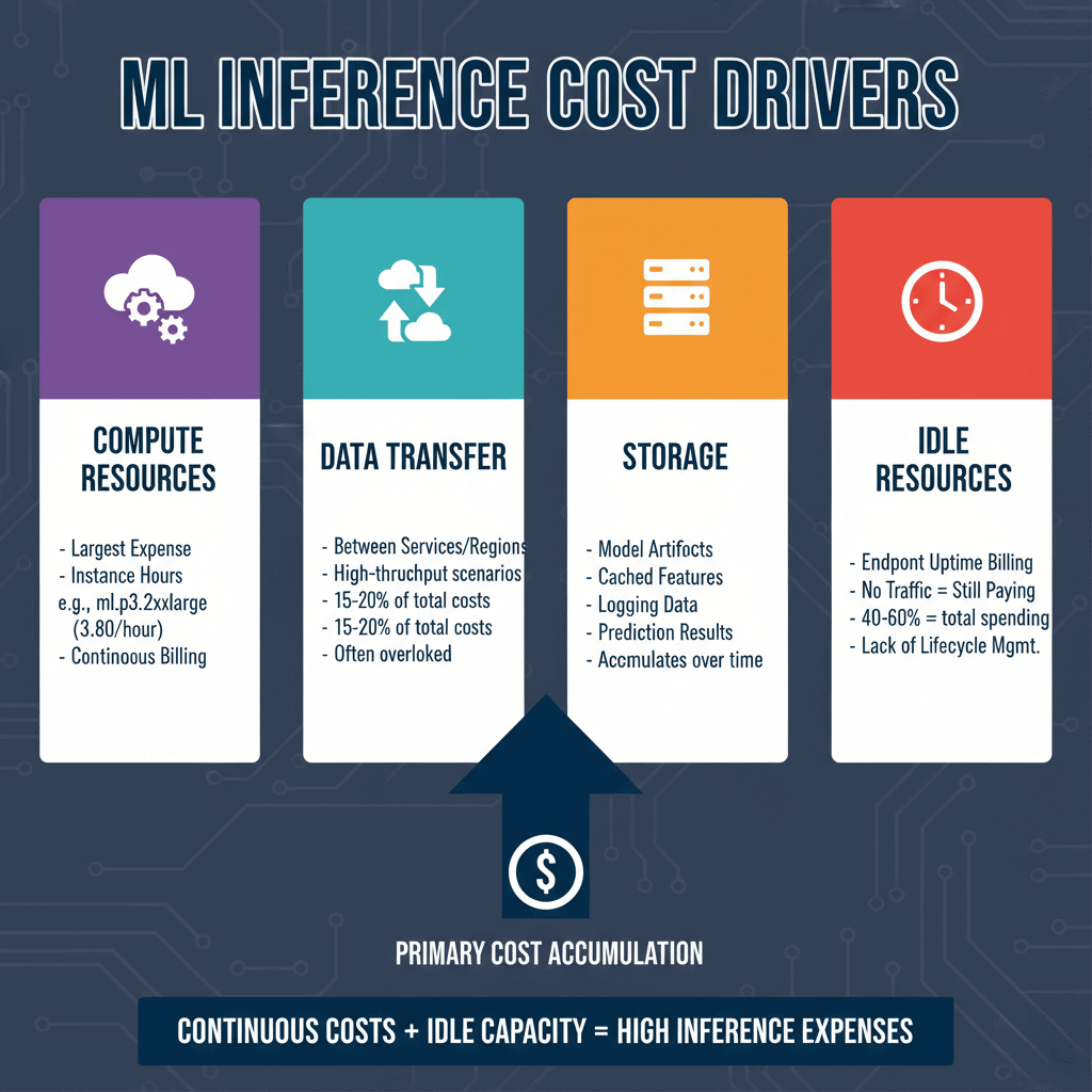 ML inference costs accumulate continuously as long as models serve predictions. The primary drivers include compute resources for instance hours, data transfer fees between services and regions, storage for model artifacts and logs, and idle resource consumption when endpoints sit unused.