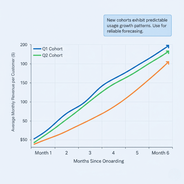 - Forecast usage-based revenue by cohort: Analyze how new customers grow usage over months 1-12—most follow predictable trajectories. Segment by usage tier (light vs. power users) for accurate projections. Specialized tools (Drivetrain, Mosaic) improve accuracy at scale.