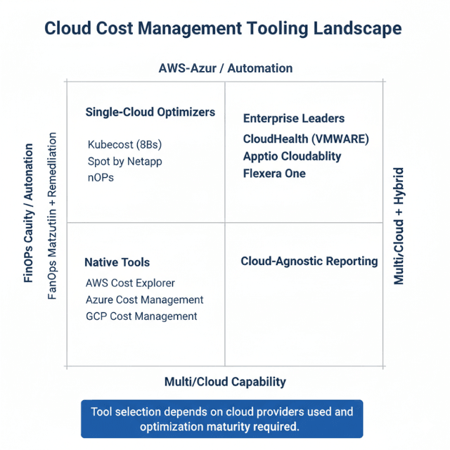 CloudHealth and Apptio lead the enterprise market with comprehensive capabilities. Specialized tools like Kubecost optimize specific platforms like Kubernetes. Selection depends on cloud providers used, organizational size, FinOps maturity, and specific requirements like multi-cloud visibility or container cost management.
