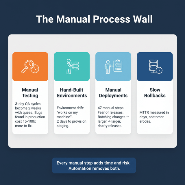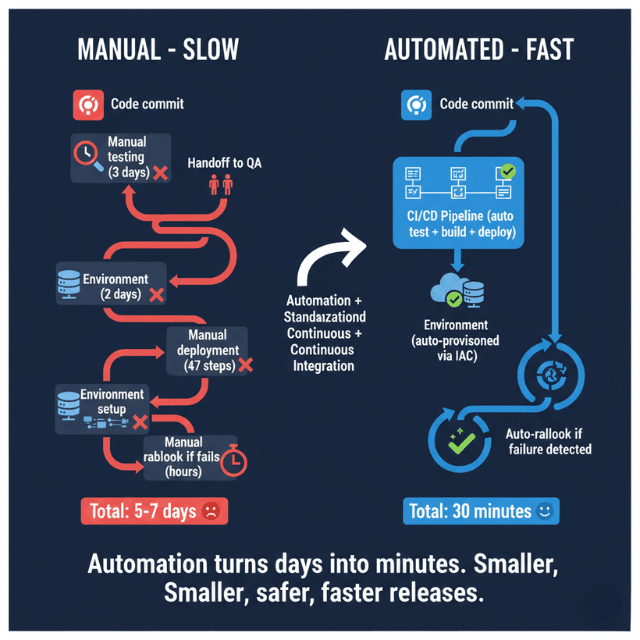 - Manual processes feel safe but add risk through slower feedback and larger batches