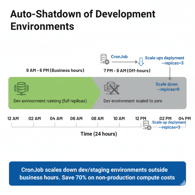 Auto-shutdown development environments outside business hours. Use spot or preemptible instances for non-production workloads. According to Flexera's State of the Cloud Report 2024, organizations waste an average of 28% of cloud spend, with non-production environment sprawl as a leading cause.