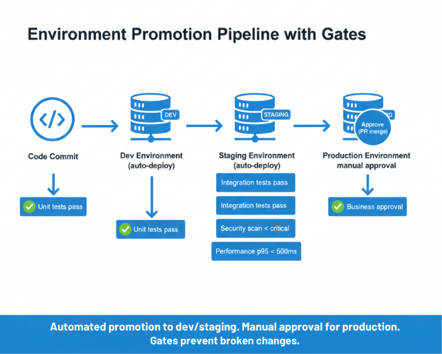 - Implement hybrid promotion – Auto to dev/staging, manual approval for prod