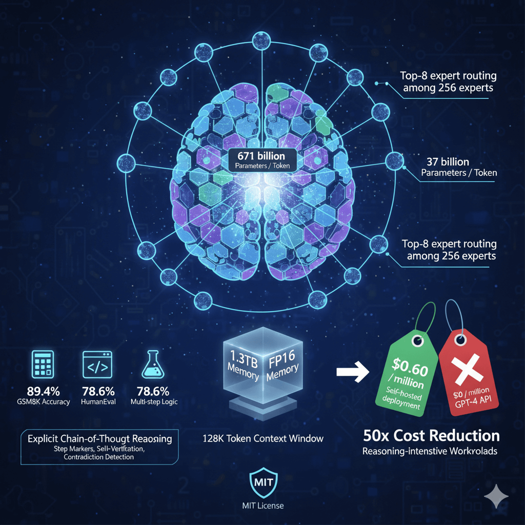 - MoE architecture activates only 37B of 671B parameters per token for efficient inference