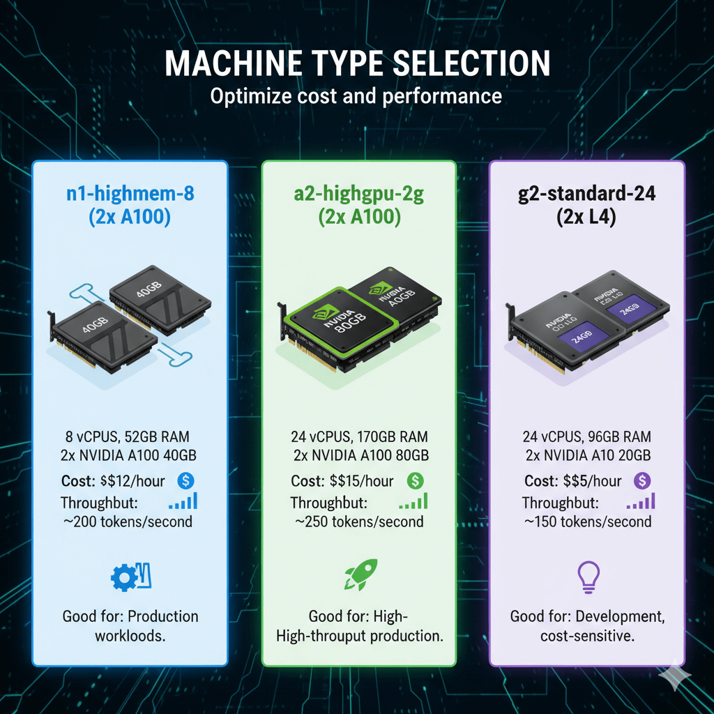 Deploy Mixtral on n1-highmem-8 with 2x A100 GPUs for $12/hour on-demand, or reduce costs by 37-55% through committed use discounts for predictable workloads. Use GPTQ 4-bit quantization to fit on single A100 instances, cutting costs in half with minimal quality loss. For variable traffic patterns, configure auto-scaling from 2 to 20 replicas to balance responsiveness and efficiency.