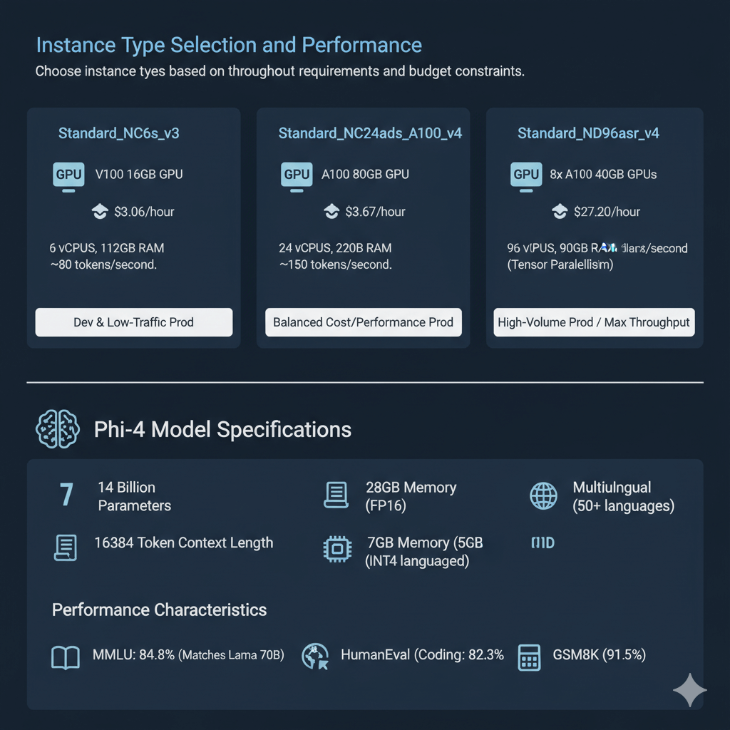 The combination of Phi-4 and Azure ML managed endpoints offers unique advantages for production deployments. Native Azure integration ensures optimal performance with 30-50ms P95 latency on Standard_NC6s_v3 instances. Managed infrastructure eliminates cluster management overhead while providing auto-scaling with pay-per-use pricing. Built-in model registry and versioning simplify deployment workflows. Organizations achieve 60% cost reduction compared to larger models while maintaining comparable quality on targeted tasks. This guide covers deployment options from serverless to dedicated endpoints, instance type selection, optimization techniques including quantization, auto-scaling configuration, and production monitoring. Phi-4 works best for enterprise applications requiring data residency, cost-sensitive production deployments, teams without Kubernetes expertise, workloads with variable traffic patterns, and compliance-focused organizations.