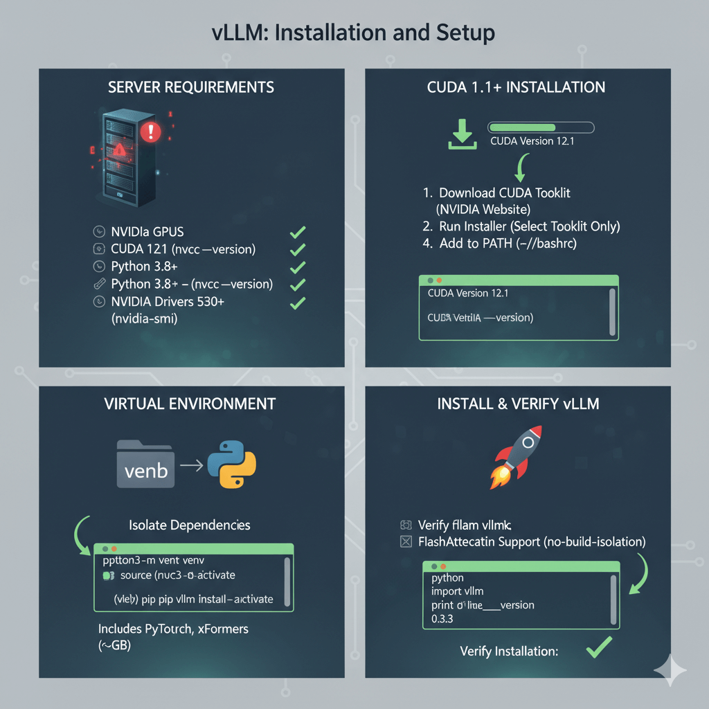 Install vLLM on your bare metal server with NVIDIA GPUs. You need CUDA 12.1 or later, Python 3.8+, and NVIDIA drivers 530+. Check your driver version with nvidia-smi to verify you have driver version 530 or higher.