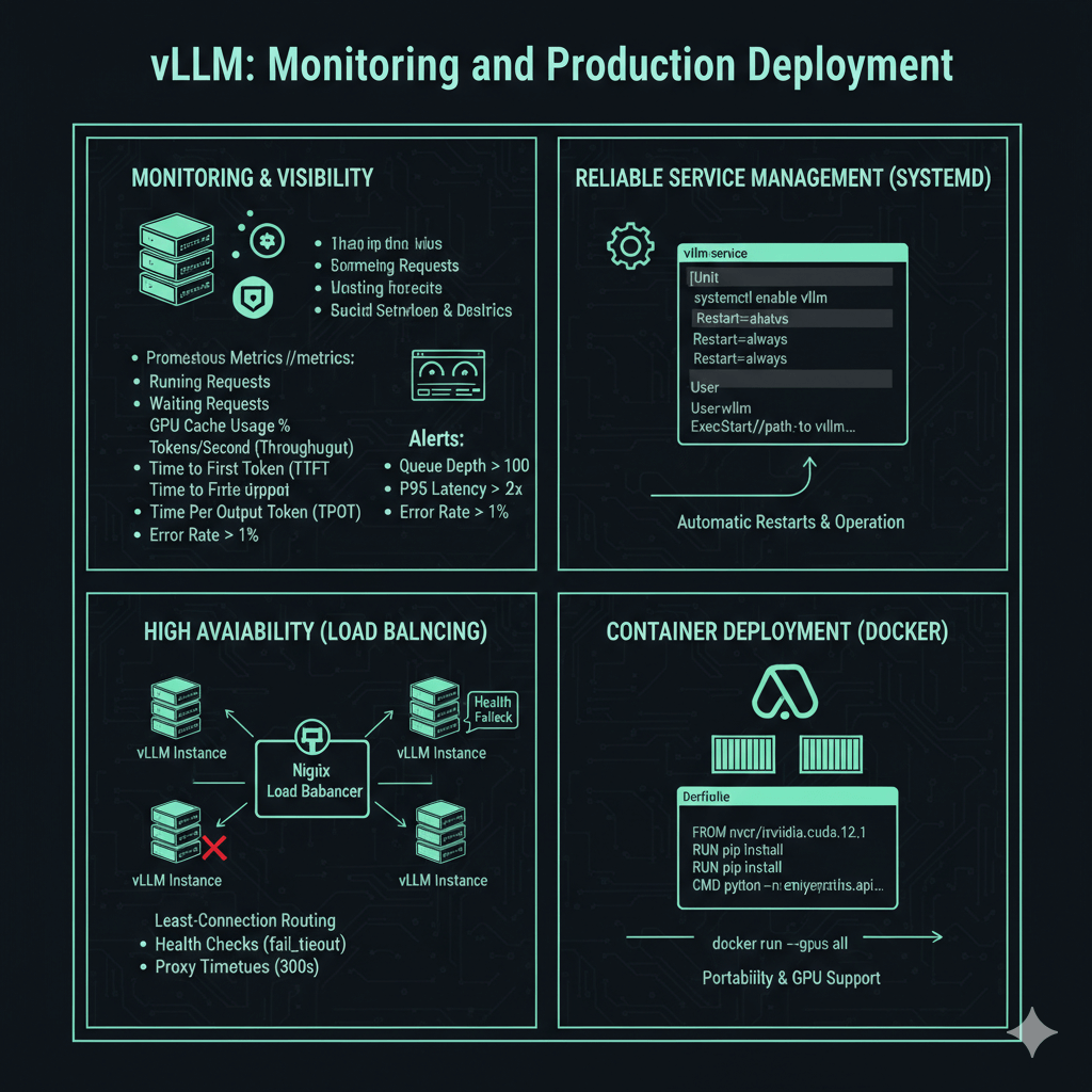 Production deployments require monitoring and reliable service management. vLLM exposes Prometheus metrics at the /metrics endpoint, providing visibility into system performance. Key metrics include the number of running requests, waiting requests in the queue, GPU cache usage percentage, average generation throughput in tokens per second, average time to first token, and average time per output token.