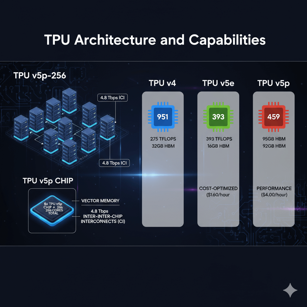 TPU pods combine multiple chips into high-performance units. v5p-8 provides 8 cores on 1 host, v5p-32 delivers 32 cores on 4 hosts, and v5p-256 scales to 256 cores across 32 hosts. Each chip features 95GB high-bandwidth memory (HBM), vector memory for fast operations, and 4.8 Tbps inter-chip interconnects (ICI) enabling efficient model parallelism.