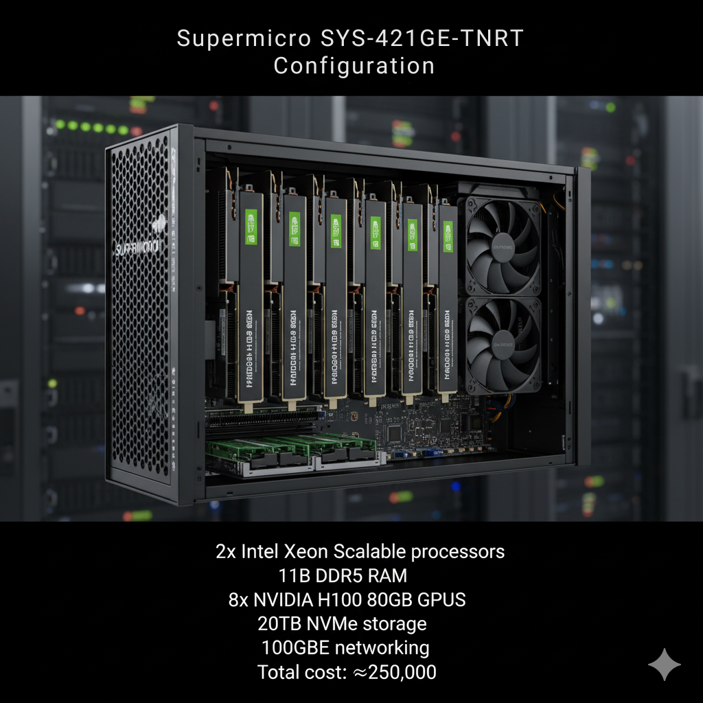 Enterprise deployments handling 70B+ parameter models require €150,000-€300,000 for servers with 8x A100 or H100 GPUs. Factor in networking, cooling, and redundancy.