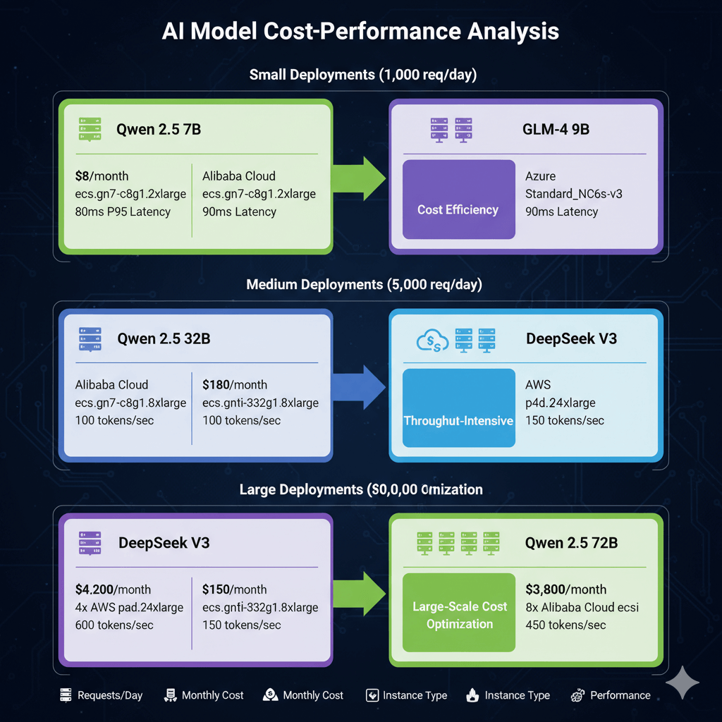 Medium deployments processing 50,000 requests daily: Qwen 2.5 32B costs $180 monthly on Alibaba Cloud ecs.gn7i-c32g1.8xlarge delivering 100 tokens per second, while DeepSeek V3 requires $350 monthly on AWS p4d.24xlarge achieving 150 tokens per second through MoE efficiency. Choose DeepSeek V3 for throughput-intensive workloads.