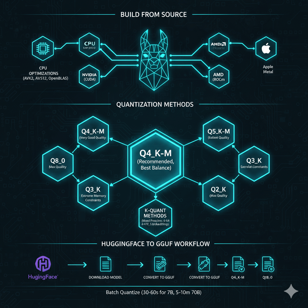 llama.cpp enables efficient LLM inference on consumer hardware through innovative quantization and cross-platform optimization. Choose Q4_K_M quantization for most production deployments with 70% size reduction and minimal quality loss. Use hybrid CPU and GPU offloading to run large models on consumer hardware by splitting layers across available resources. Deploy with systemd for reliable service management or Docker for portable containerized deployment. While llama.cpp cannot match vLLM or TensorRT-LLM for pure GPU throughput, it excels at CPU-only inference, hybrid CPU/GPU deployment, and cross-platform portability including ARM processors. For edge deployment, CPU servers, mixed infrastructure, or when simplicity and portability matter more than maximum throughput, llama.cpp provides the optimal solution for running quantized LLMs on diverse hardware.