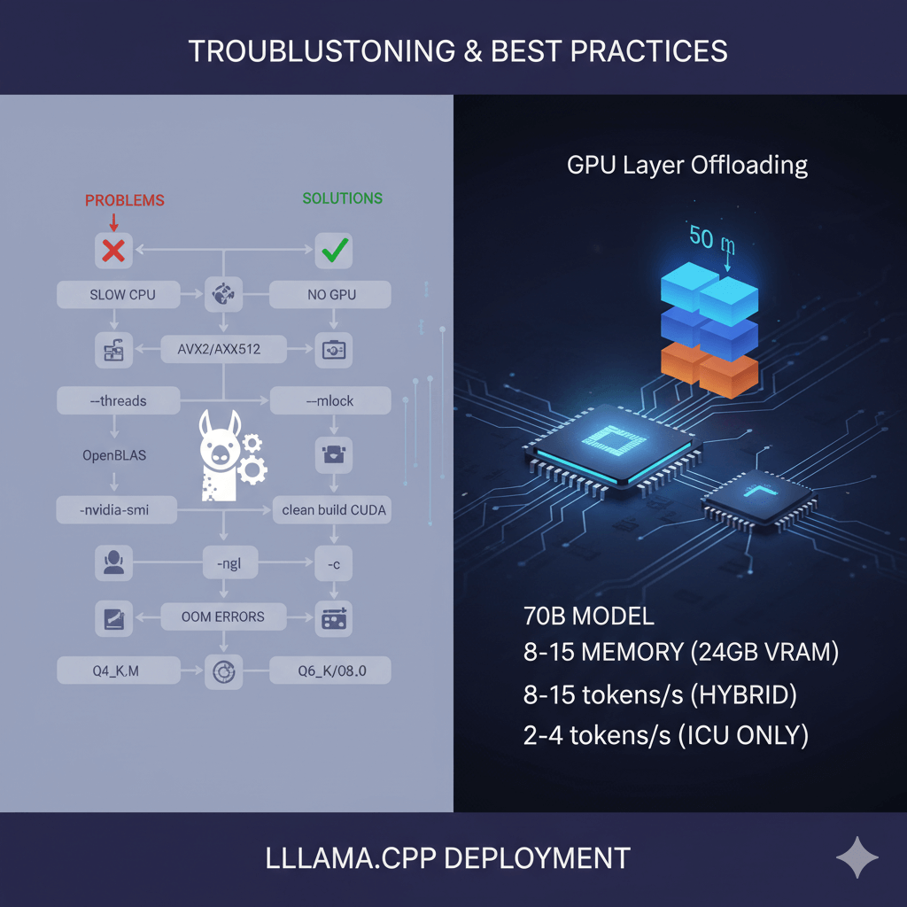 Solve common llama.cpp deployment problems. For slow CPU inference, enable AVX2/AVX512 by checking compile flags, increase thread count with the --threads parameter, rebuild with OpenBLAS support for optimized linear algebra, and lock memory with --mlock to prevent swapping. If GPU is not detected, verify CUDA is installed with nvidia-smi, rebuild with GPU support using clean build and CUDA flags, and check GPU layers by starting with -ngl 1 and increasing gradually.