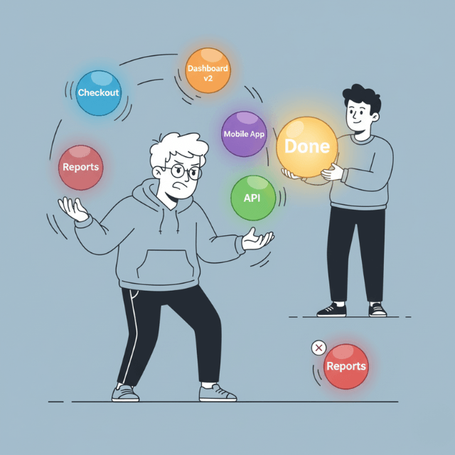 European startups often face this problem acutely. Investor pressure, customer requests, and competitive threats create constant temptation to start new initiatives. Features end up half-done everywhere while customers wait for complete solutions.