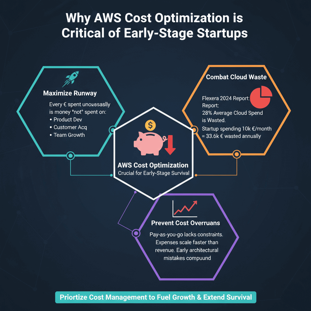 Runway defines survival for early-stage startups. Every euro spent on unnecessary AWS resources is money not spent on product development, customer acquisition, or team growth.