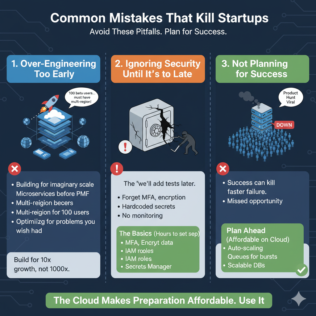 Startups often over-engineer too early by adopting complex technologies before product-market fit, ignore basic security practices, or fail to plan for success (like traffic spikes). Focusing on simplicity and evolution is key.