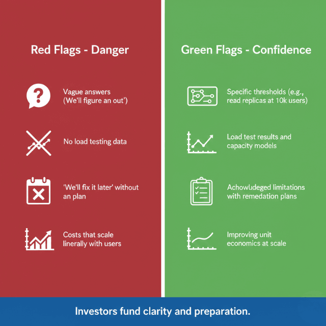 Clarity beats perfection in investor conversations. You do not need a perfectly scalable system. You need a clear understanding of your current state, known limitations, and credible plans for improvement. Investors fund teams that demonstrate this understanding.