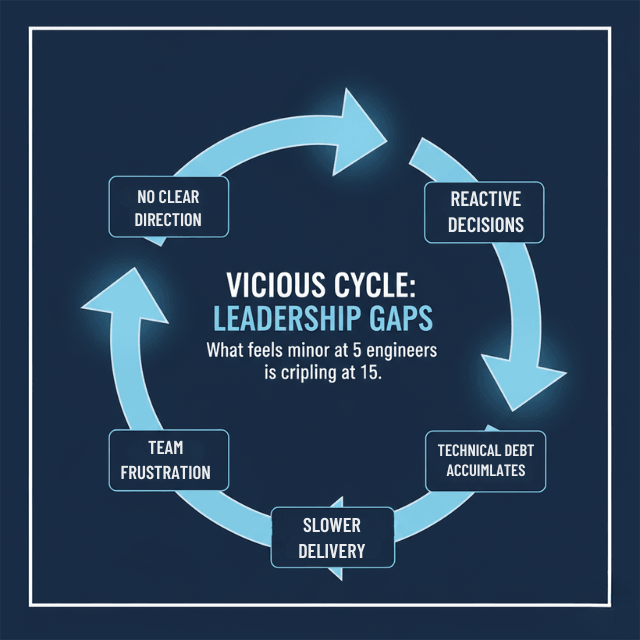 Leadership gaps hurt more than skill gaps. A team of talented engineers without direction will underperform a smaller team with clear ownership and aligned priorities.