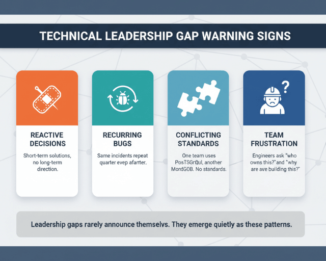 Technical leadership gaps rarely announce themselves. They emerge quietly as missed deadlines, recurring bugs, and rising frustration among engineers. By the time founders recognize the problem, months of momentum have already been lost.