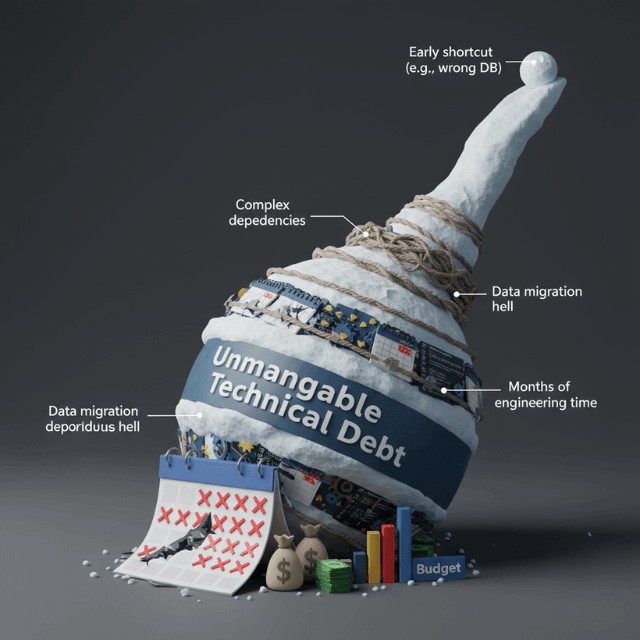 Hard-to-change architectures emerge from these decisions. A database choice made in week two might require months of migration work later. Evaluate exit costs and portability before committing to services that store your data.